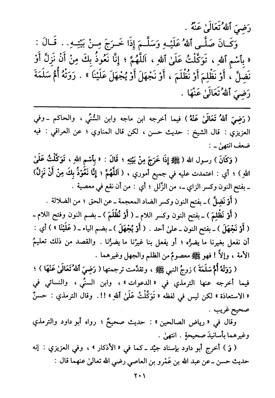 (روته أمّ سلمة) زوج النبي صلى الله عليه وسلّم، وتقدّمت ترجمتها (رضي الله تعالى عنها) ؛ فيما أخرجه عنها الترمذي في «الدعوات» ، وابن السنّي، والنسائي في «الاستعاذة» لكن ليس في لفظه «توكّلت على الله» !!. وقال الترمذي: حسن صحيح غريب.