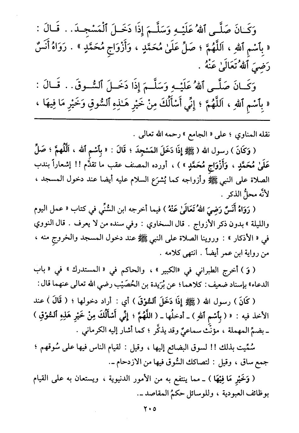 (رواه أنس رضي الله تعالى عنه) فيما أخرجه ابن السّنّي في كتاب «عمل اليوم والليلة» بدون ذكر الأزواج. قال السخاوي: وفي سنده من لا يعرف. قال النووي في «الأذكار» : وروينا الصلاة على النبي صلى الله عليه وسلّم عند دخول المسجد والخروج منه، من رواية ابن عمر أيضا. انتهى كلامه.