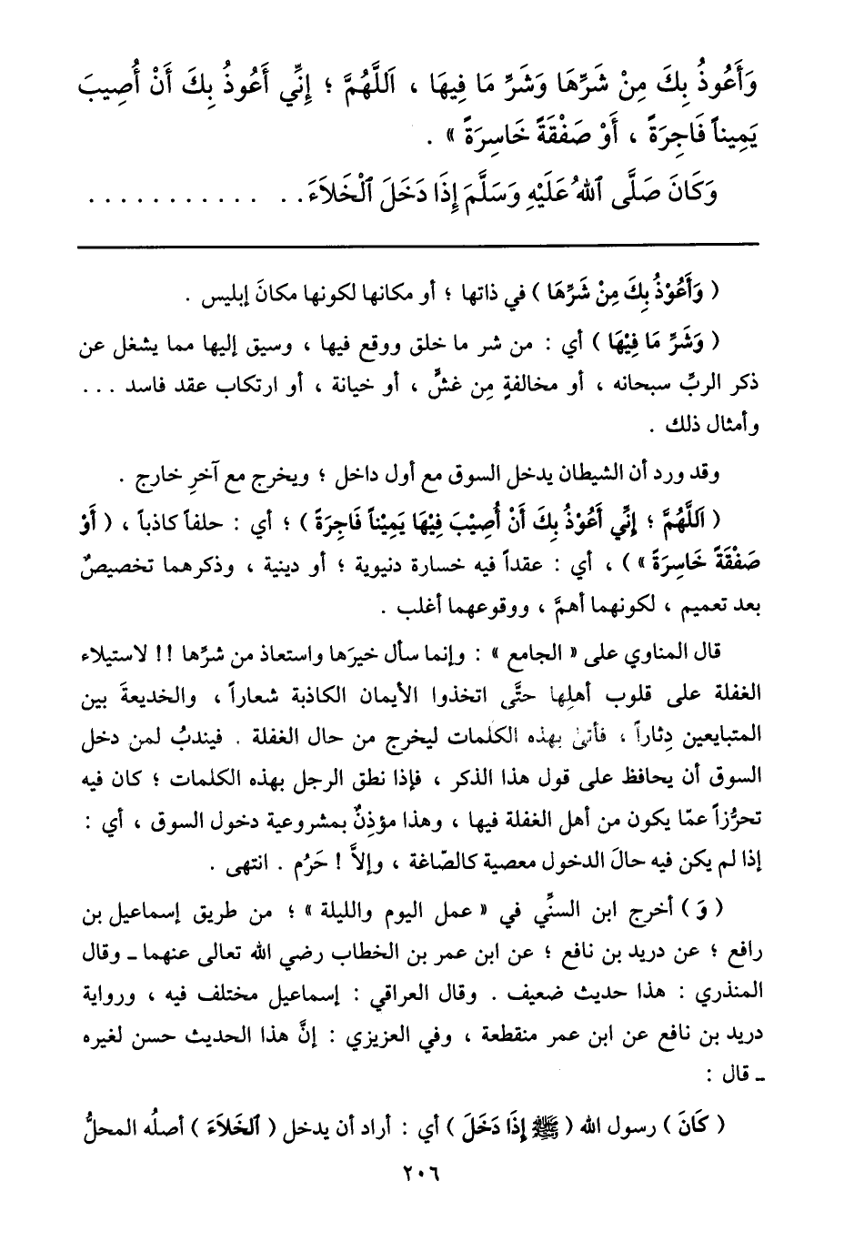 قال المناوي على «الجامع» : وإنما سأل خيرها واستعاذ من شرّها!! لاستيلاء الغافلة على قلوب أهلها حتّى اتخذوا الأيمان الكاذبة شعارا، والخديعة بين المتبايعين دثارا، فأتى بهذه الكلمات ليخرج من حال الغافلة. فيندب لمن دخل السوق أن يحافظ على قول هذا الذكر، فإذا نطق الرجل بهذه الكلمات؛ كان فيه تحرّزا عمّا يكون من أهل الغافلة فيها، وهذا مؤذن بمشروعية دخول السوق، أي: