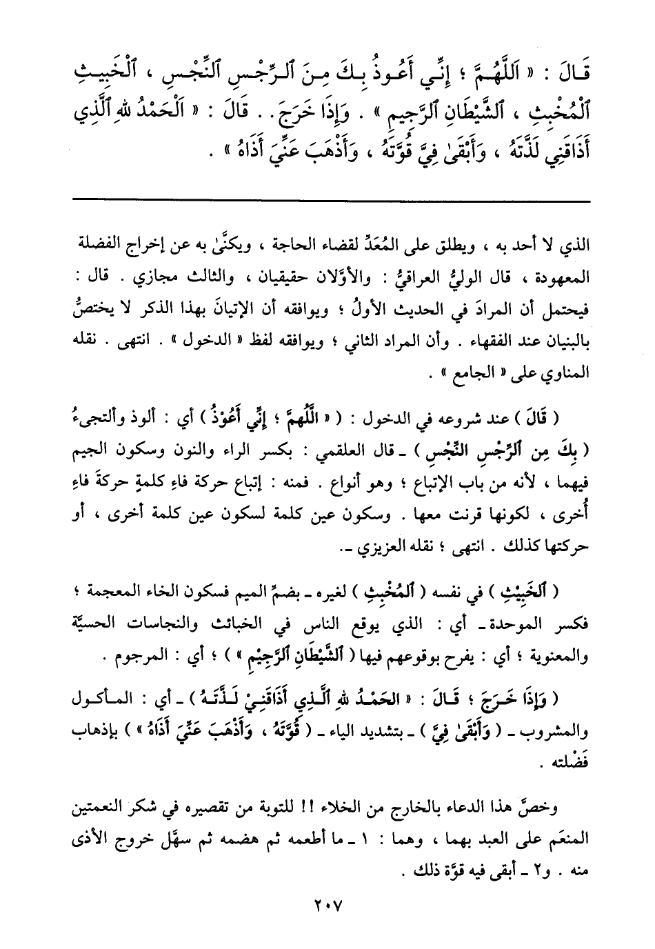 قال: «اللهمّ؛ إنّي أعوذ بك من الرّجس النّجس، الخبيث المخبث، الشّيطان الرّجيم» . وإذا خرج.. قال: «الحمد لله الّذي أذاقني لذّته، وأبقى فيّ قوّته، وأذهب عنّي أذاه» .