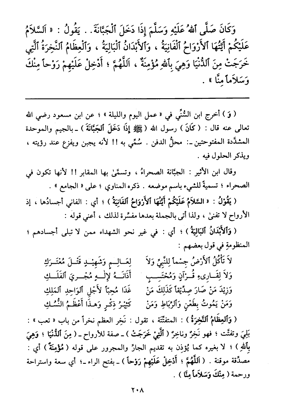 (و) أخرج ابن السّنّي في «عمل اليوم والليلة» ؛ عن ابن مسعود رضي الله تعالى عنه قال: (كان) رسول الله (صلى الله عليه وسلّم إذا دخل الجبّانة) - بالجيم والموحدة المشدّدة المفتوحتين-: محلّ الدفن. سمّي به!! لأنه يجبن ويفزع عند رؤيته، ويذكر الحلول فيه.