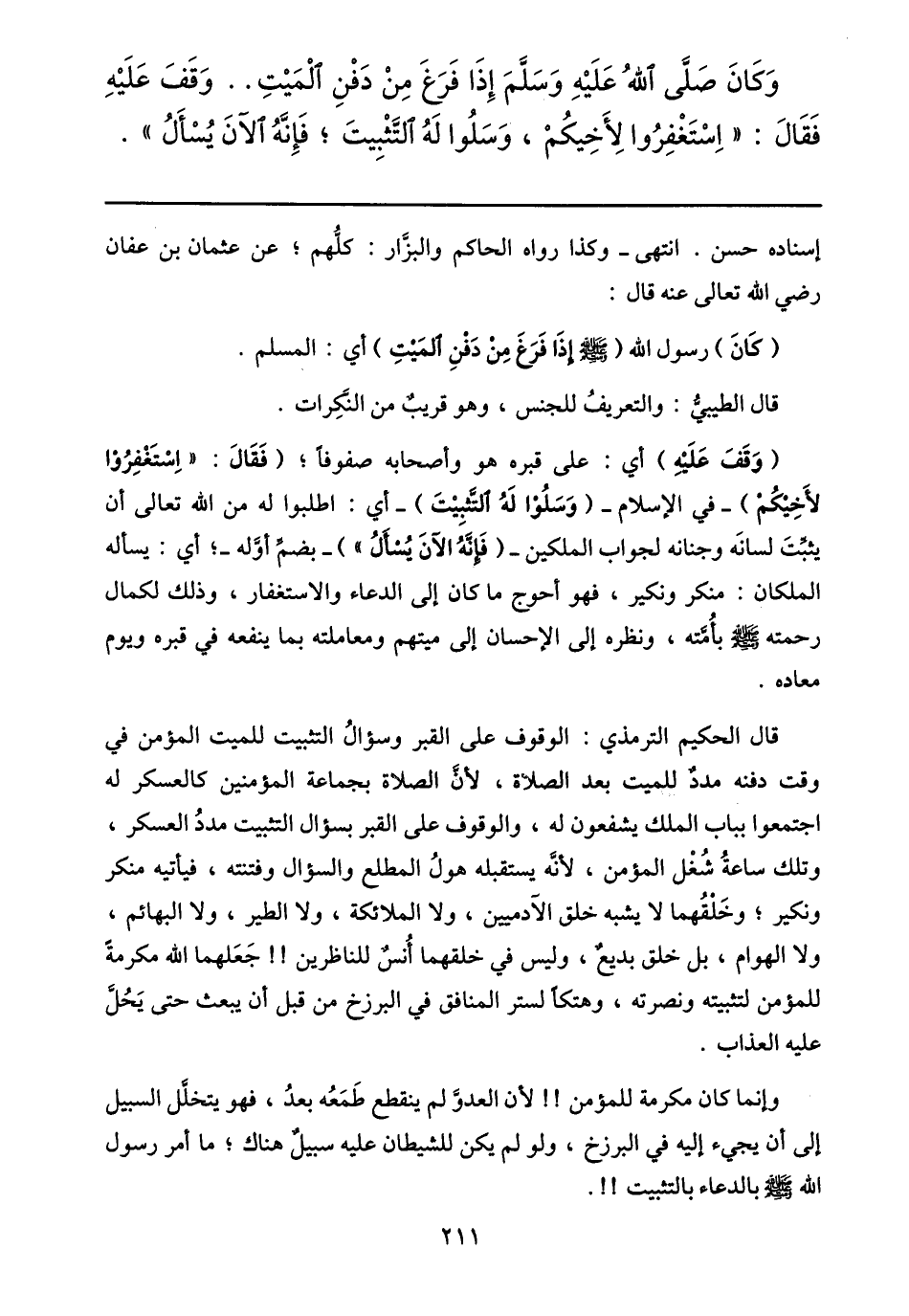 وكان صلّى الله عليه وسلّم إذا فرغ من دفن الميت.. وقف عليه فقال: «استغفروا لأخيكم، وسلوا له التّثبيت؛ فإنّه الآن يسأل» .