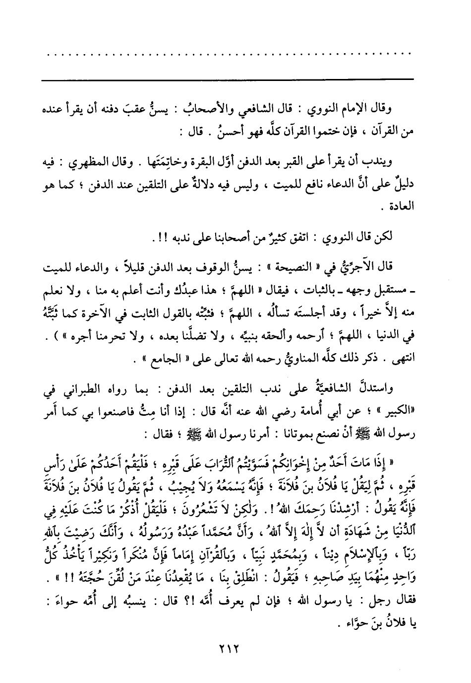 «إذا مات أحد من إخوانكم فسوّيتم التّراب على قبره؛ فليقم أحدكم على رأس قبره، ثمّ ليقل يا فلان بن فلانة؛ فإنّه يسمعه ولا يجيب، ثمّ يقول يا فلان بن فلانة فإنّه يقول: أرشدنا رحمك الله!. ولكن لا تشعرون؛ فليقل أذكر ما كنت عليه في الدّنيا من شهادة أن لّا إله إلّا الله، وأنّ محمّدا عبده ورسوله، وأنّك رضيت بالله ربّا، وبالإسلام دينا، وبمحمّد نبيّا، وبالقرآن إماما فإنّ منكرا ونكيرا يأخذ كلّ واحد منهما بيد صاحبه؛ فيقول: انطلق بنا، ما يقعدنا عند من لقّن حجّته!!» .