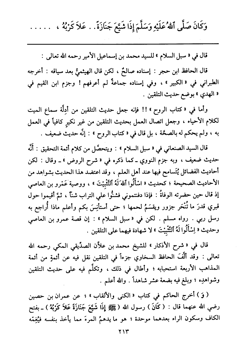 قال السيد الصنعاني في «سبل السلام» : ويتحصّل من كلام أئمة التحقيق: أنّه حديث ضعيف، وبه جزم النووي- كما ذكره في «شرح الروض» - وقال: لكن أحاديث الفضائل يتسامح فيها عند أهل العلم، وقد اعتضد هذا الحديث بشواهد من الأحاديث الصحيحة؛ كحديث «اسألوا الله له التّثبيت» ، ووصية عمرو بن العاصي إذ قال حين حضرته الوفاة: فإذا دفنتموني فشنّوا علي التراب شنّا، ثمّ أقيموا حول قبري قدر ما تنحر جزور ويقسم لحمها؛ حتى أستأنس بكم وأعلم ماذا أراجع به رسل ربي. رواه مسلم. لكن في «سبل السلام» : إن قصة عمرو بن العاصي وحديث «اسألوا له التّثبيت» لا شهادة فيهما على التلقين.