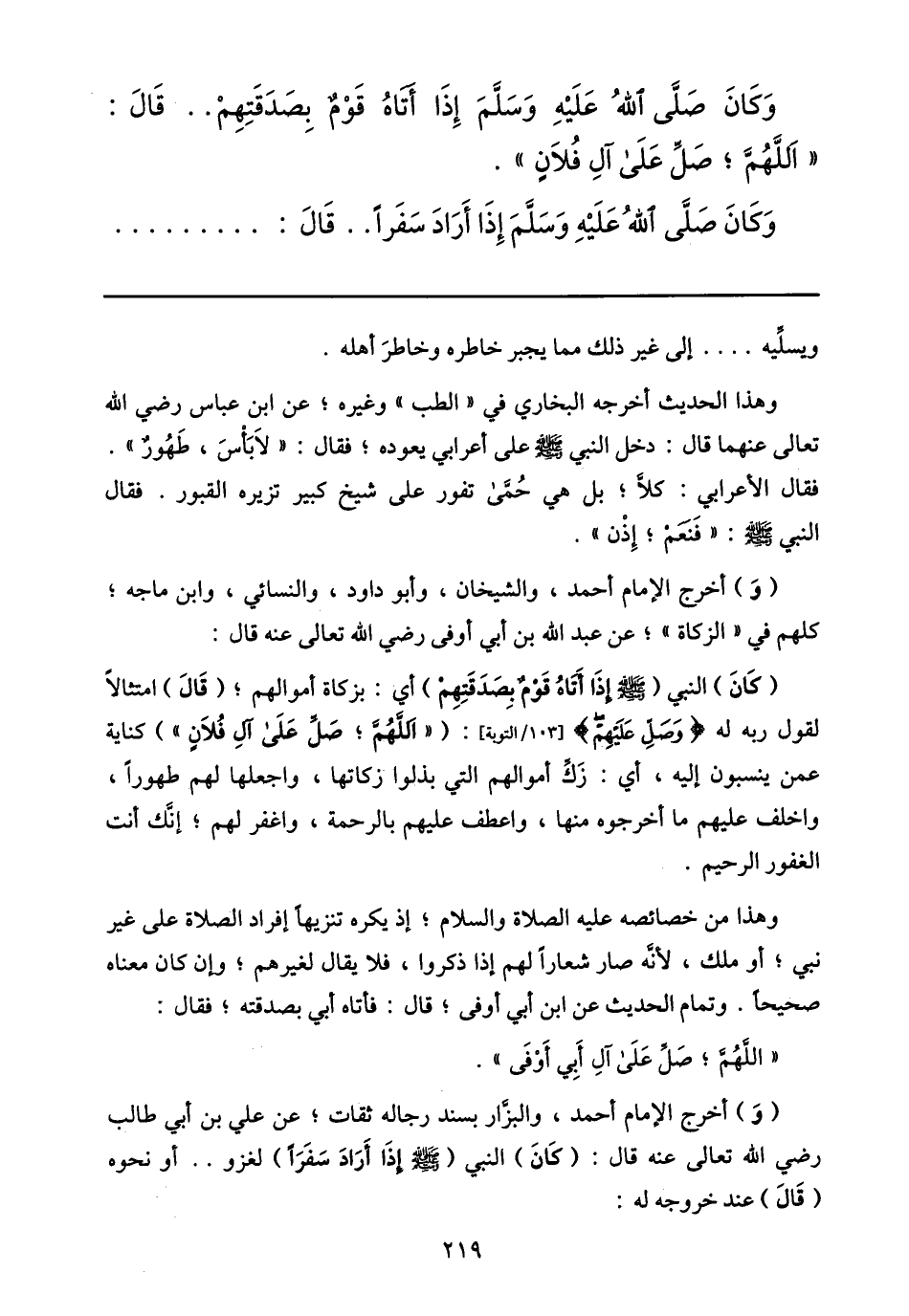 وهذا من خصائصه عليه الصلاة والسلام؛ إذ يكره تنزيها إفراد الصلاة على غير نبي؛ أو ملك، لأنّه صار شعارا لهم إذا ذكروا، فلا يقال لغيرهم؛ وإن كان معناه صحيحا. وتمام الحديث عن ابن أبي أوفى؛ قال: فأتاه أبي بصدقته؛ فقال: