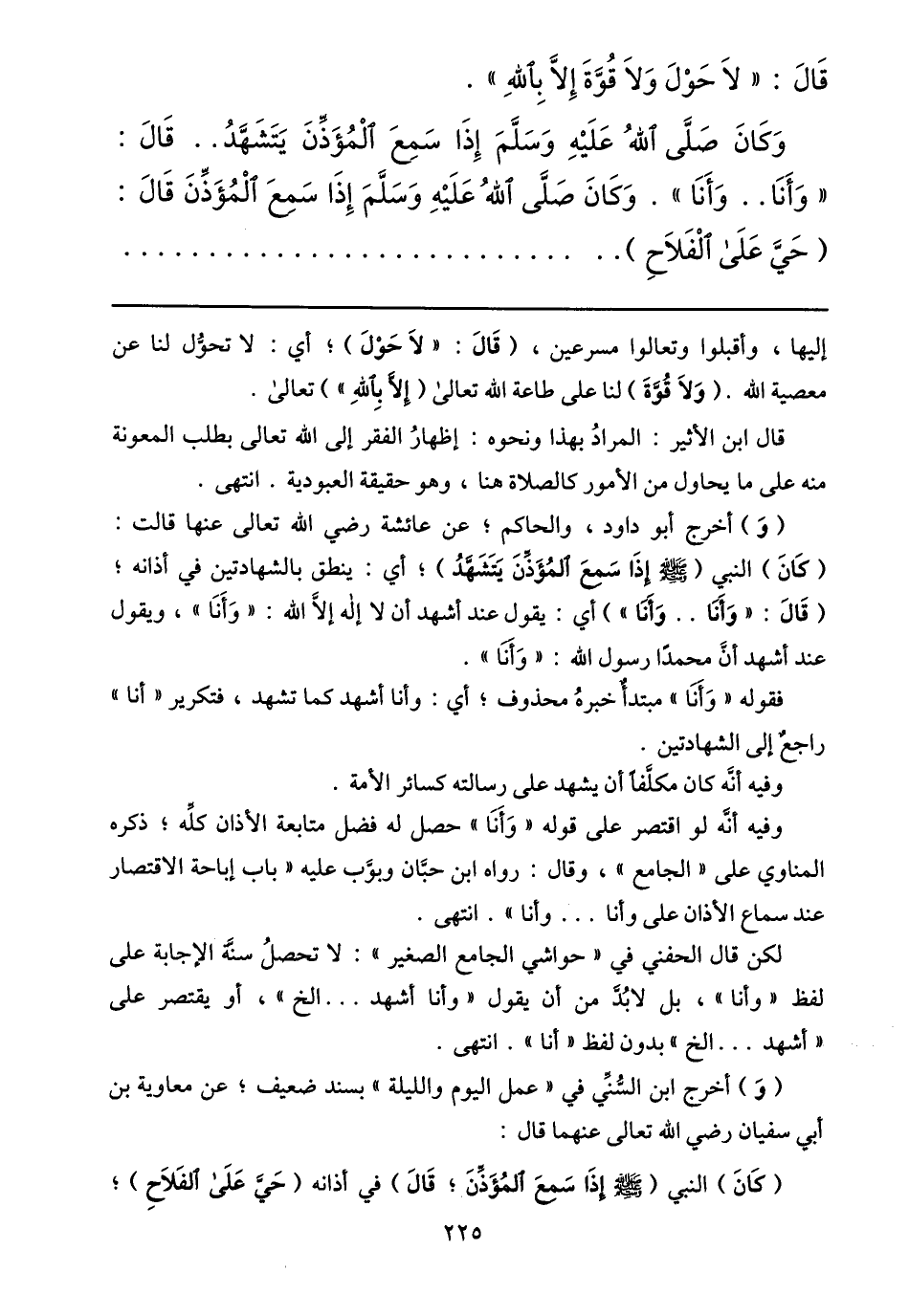وفيه أنّه لو اقتصر على قوله «وأنا» حصل له فضل متابعة الأذان كلّه؛ ذكره المناوي على «الجامع» ، وقال: رواه ابن حبّان وبوّب عليه «باب إباحة الاقتصار عند سماع الأذان على وأنا ... وأنا» . انتهى.
