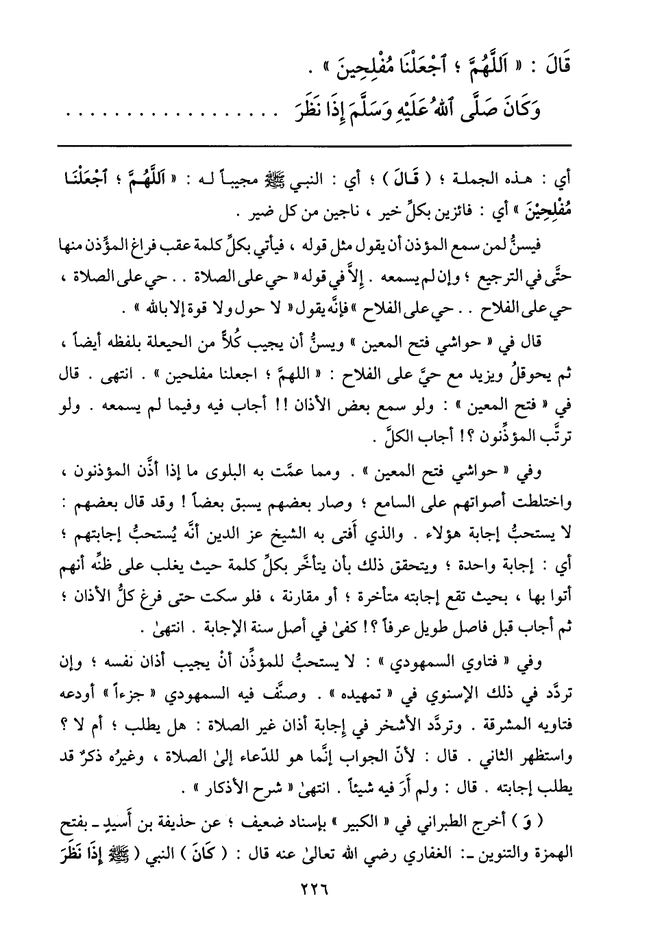 قال في «حواشي فتح المعين» ويسنّ أن يجيب كلّا من الحيعلة بلفظه أيضا، ثم يحوقل ويزيد مع حيّ على الفلاح: «اللهمّ؛ اجعلنا مفلحين» . انتهى. قال في «فتح المعين» : ولو سمع بعض الأذان!! أجاب فيه وفيما لم يسمعه. ولو ترتّب المؤذّنون؟! أجاب الكلّ.