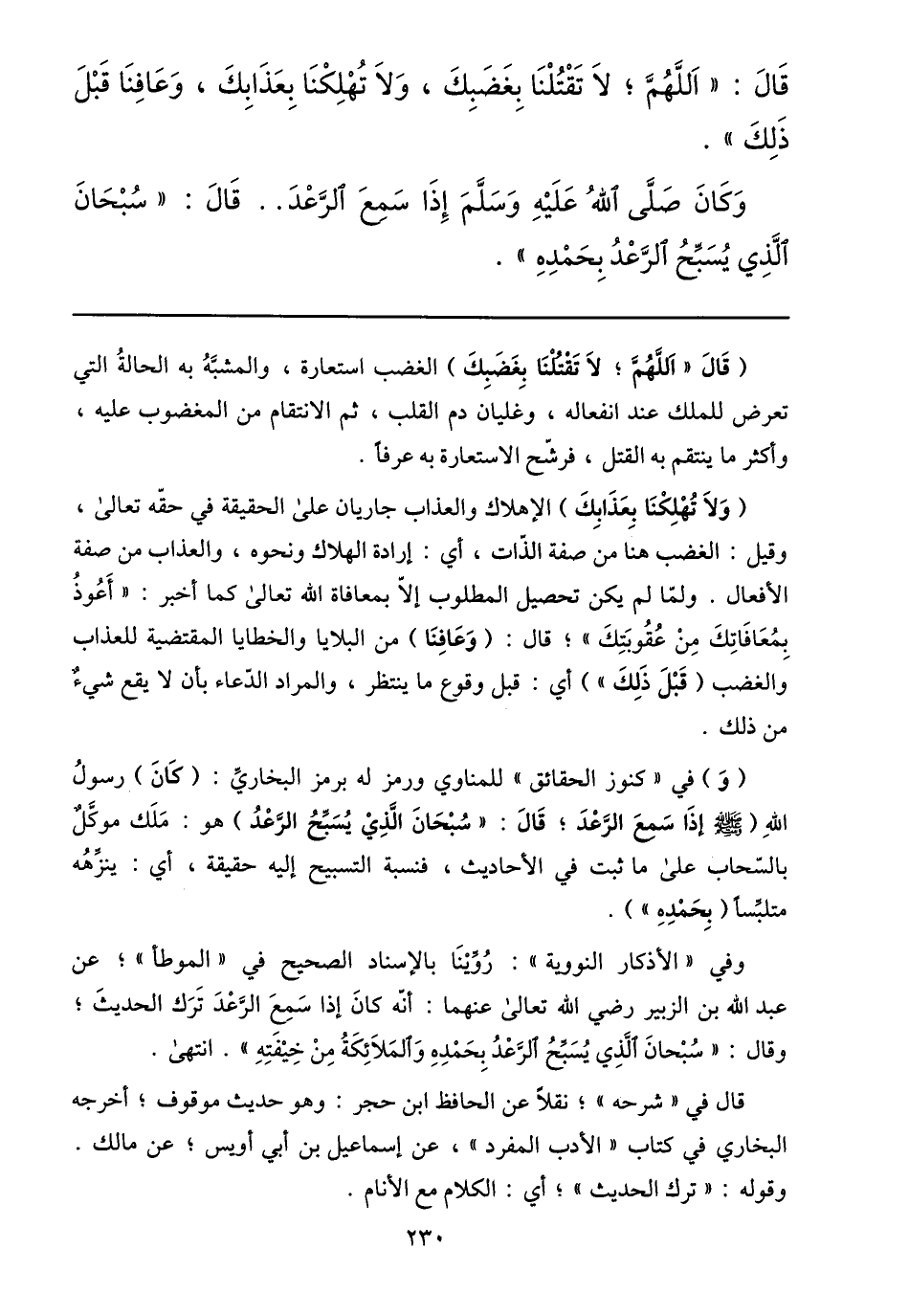 وفي «الأذكار النووية» : روّينا بالإسناد الصحيح في «الموطأ» ؛ عن عبد الله بن الزبير رضي الله تعالى عنهما: أنّه كان إذا سمع الرّعد ترك الحديث؛ وقال: «سبحان الّذي يسبّح الرّعد بحمده والملائكة من خيفته» . انتهى.