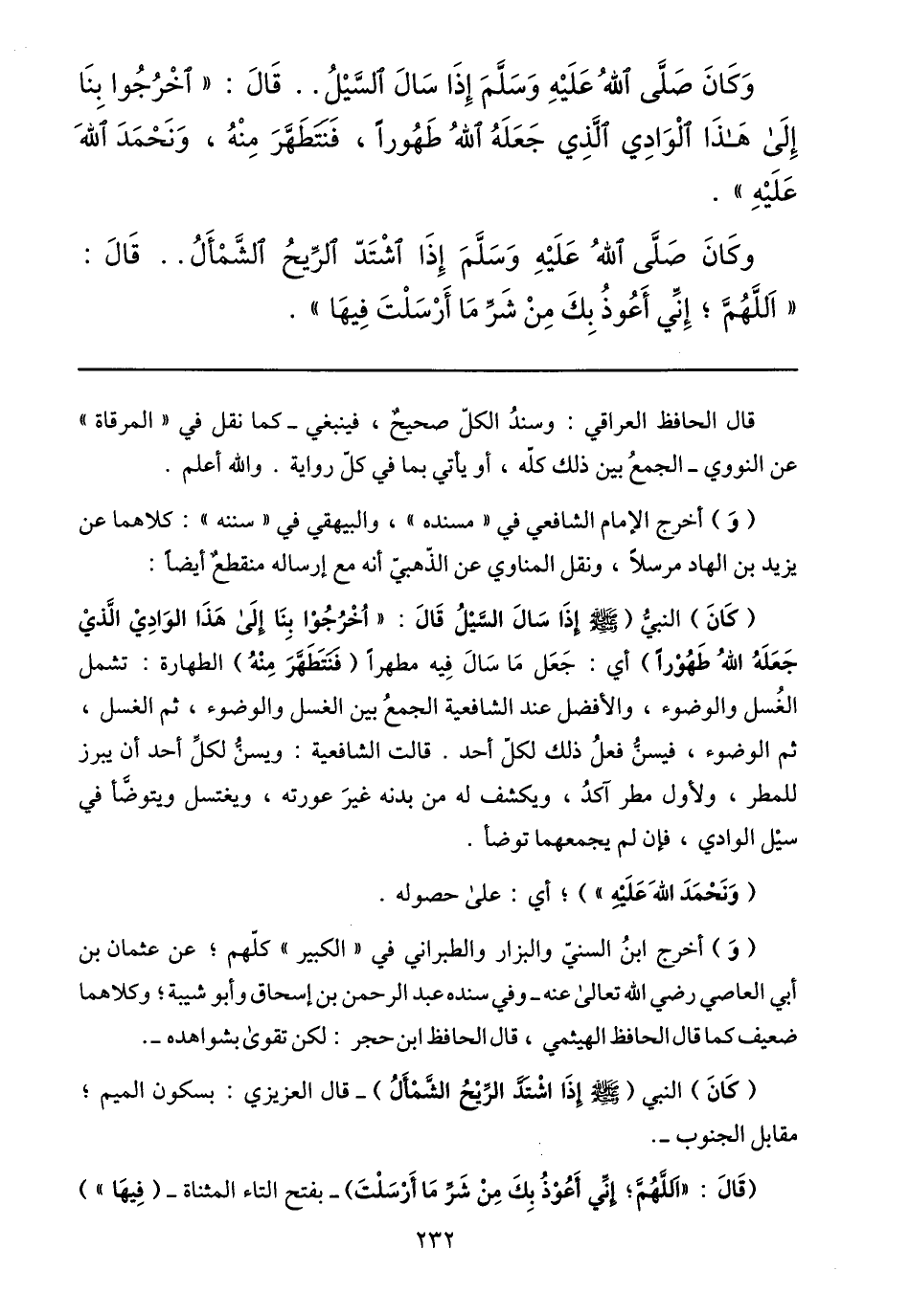 وكان صلّى الله عليه وسلّم إذا سال السّيل.. قال: «اخرجوا بنا إلى هذا الوادي الّذي جعله الله طهورا، فنتطهّر منه، ونحمد الله عليه» .