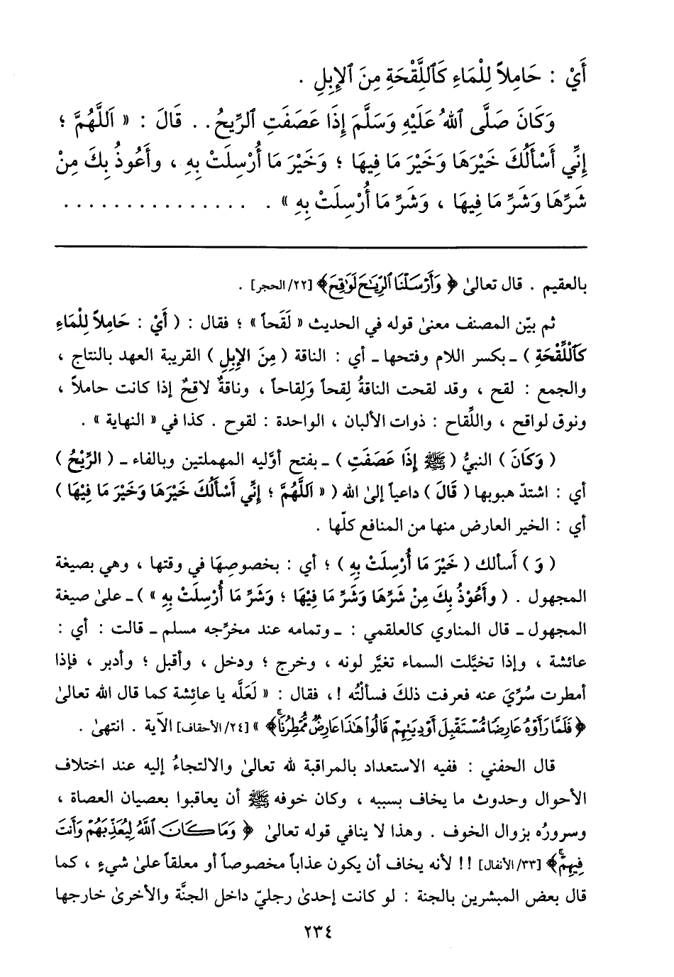 وكان صلّى الله عليه وسلّم إذا عصفت الرّيح.. قال: «اللهمّ؛ إنّي أسألك خيرها وخير ما فيها؛ وخير ما أرسلت به، وأعوذ بك من شرّها وشرّ ما فيها، وشرّ ما أرسلت به» ...
