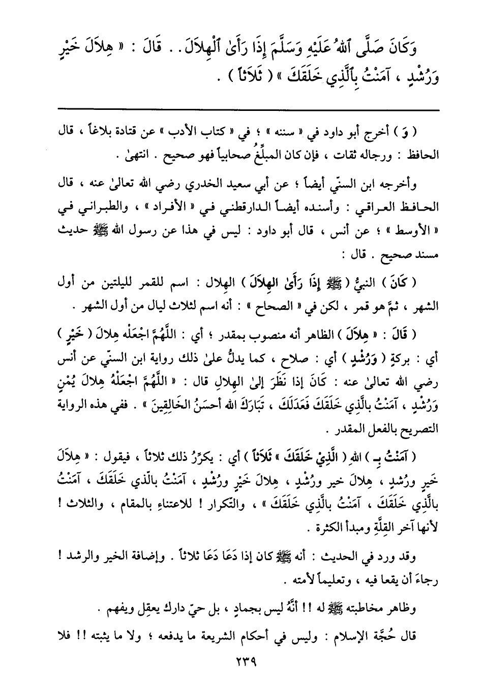 وكان صلّى الله عليه وسلّم إذا رأى الهلال.. قال: «هلال خير ورشد، آمنت بالّذي خلقك» (ثلاثا) .