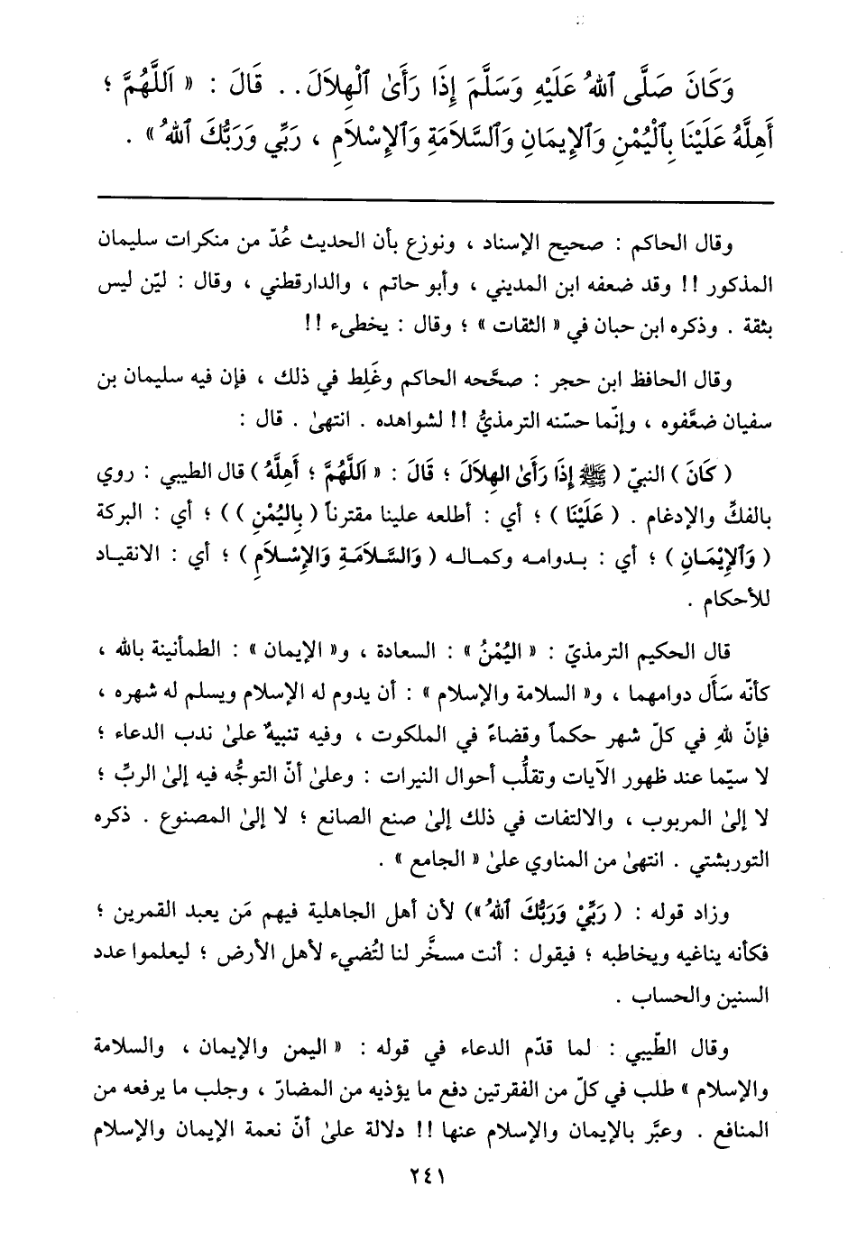 قال الحكيم الترمذيّ: «اليمن» : السعادة، و «الإيمان» : الطمأنينة بالله، كأنّه سأل دوامهما، و «السلامة والإسلام» : أن يدوم له الإسلام ويسلم له شهره، فإنّ لله في كلّ شهر حكما وقضاء في الملكوت، وفيه تنبيه على ندب الدعاء؛ لا سيّما عند ظهور الآيات وتقلّب أحوال النيرات: وعلى أنّ التوجّه فيه إلى الربّ؛ لا إلى المربوب، والالتفات في ذلك إلى صنع الصانع؛ لا إلى المصنوع. ذكره التوربشتي. انتهى من المناوي على «الجامع» .