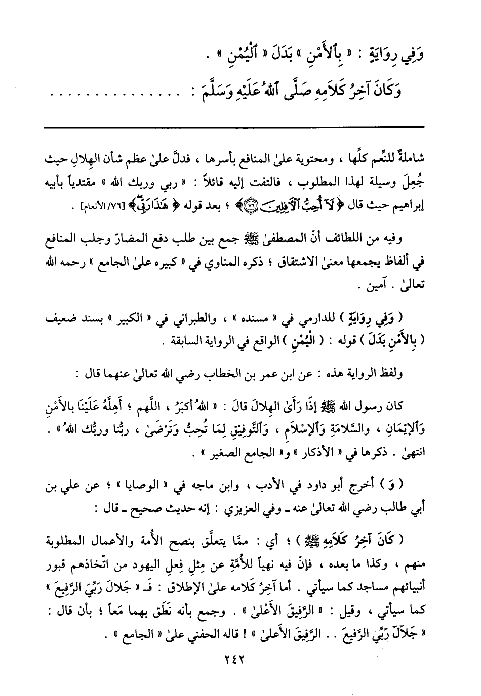كان رسول الله صلى الله عليه وسلم إذا رأى الهلال قال: «الله أكبر، اللهم؛ أهلّه علينا بالأمن والإيمان، والسّلامة والإسلام، والتّوفيق لما تحبّ وترضى، ربّنا وربّك الله» .
