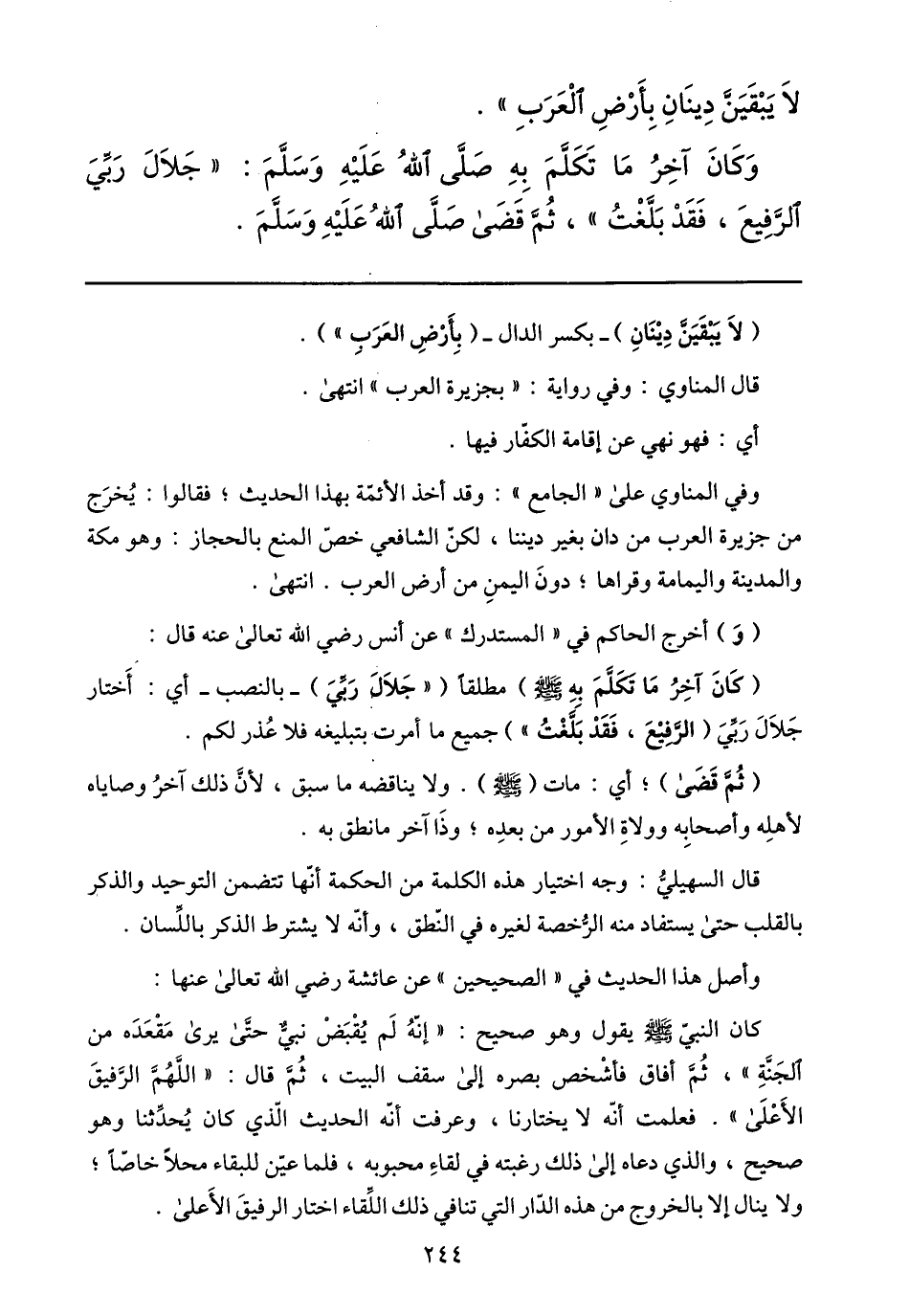 (كان آخر ما تكلّم به صلى الله عليه وسلّم) مطلقا ( «جلال ربّي) - بالنصب- أي: أختار جلال ربّي (الرّفيع، فقد بلّغت» ) جميع ما أمرت بتبليغه فلا عذر لكم.