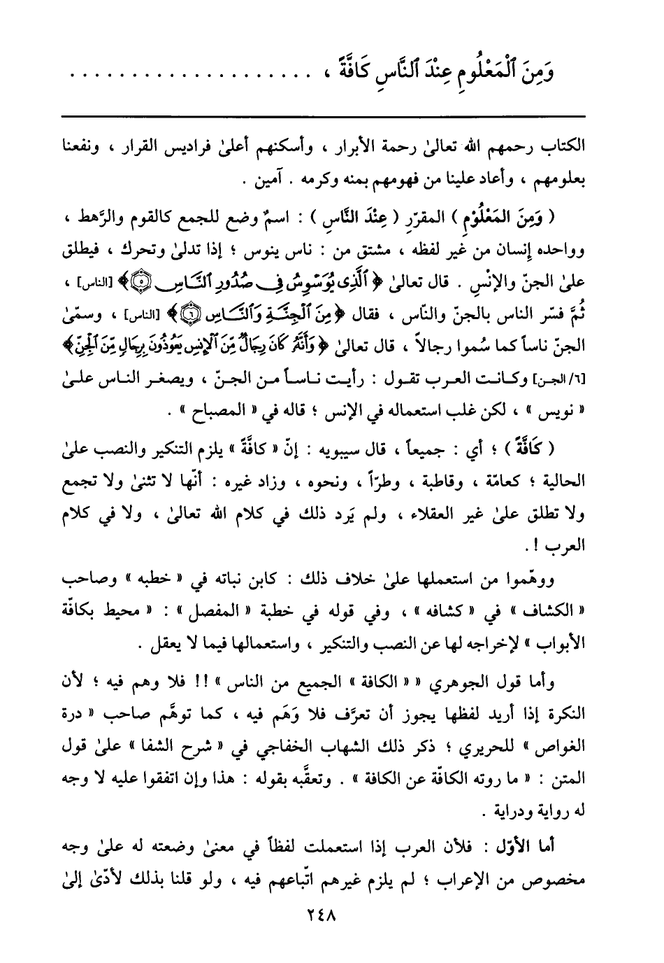 وأما قول الجوهري « «الكافة» الجميع من الناس» !! فلا وهم فيه؛ لأن النكرة إذا أريد لفظها يجوز أن تعرّف فلا وهم فيه، كما توهّم صاحب «درة الغواص» للحريري؛ ذكر ذلك الشهاب الخفاجي في «شرح الشفا» على قول المتن: «ما روته الكافّة عن الكافة» . وتعقّبه بقوله: هذا وإن اتفقوا عليه لا وجه له رواية ودراية.