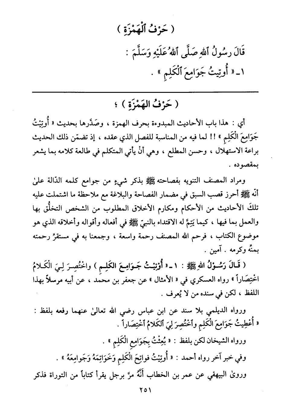 (حرف الهمزة) ؛ أي: هذا باب الأحاديث المبدوءة بحرف الهمزة، وصدّرها بحديث «أوتيت جوامع الكلم» !! لما فيه من المناسبة للفصل الذي عقده، إذ تضمّن ذلك الحديث براعة الاستهلال، وحسن المطلع، وهي أن يأتي المتكلم في طالعة كلامه بما يشعر بمقصوده.