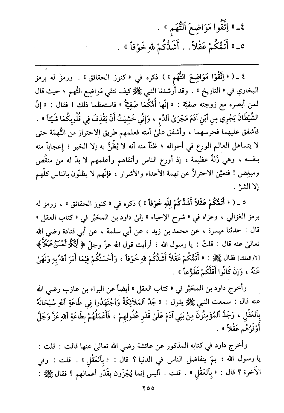 4- ( «اتّقوا مواضع التّهم» ) ذكره في «كنوز الحقائق» . ورمز له برمز البخاري في «التاريخ» . وقد أرشدنا النبي صلى الله عليه وسلّم كيف نتقي مواضع التّهم؛ حيث قال لمن أبصره مع زوجته صفيّة: «إنّها أمّكما صفيّة» فاستعظما ذلك! فقال: «إنّ الشّيطان يجري من ابن آدم مجرى الدّم، وإنّي خشيت أن يقذف في قلوبكما شيئا» .