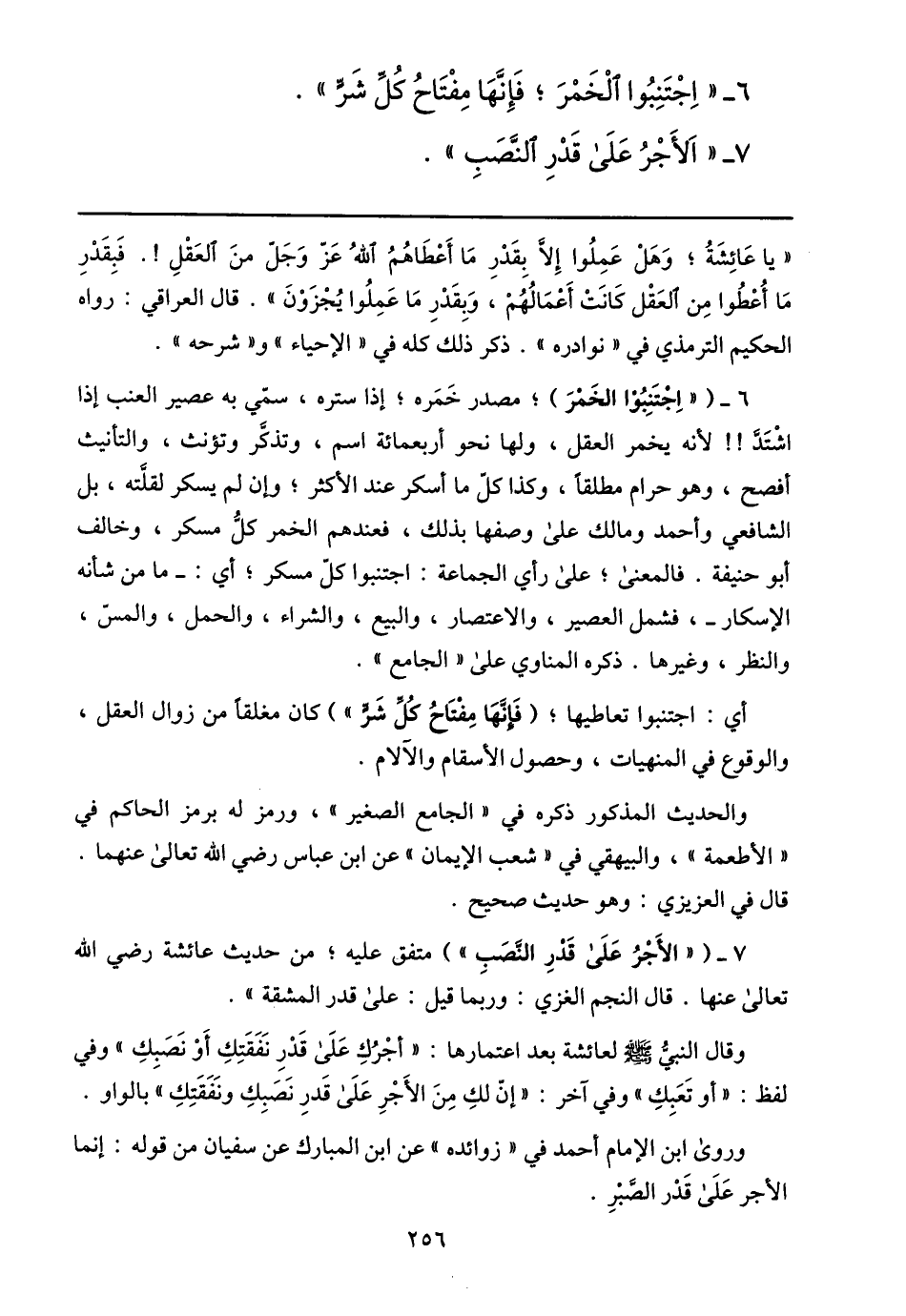 7- ( «الأجر على قدر النّصب» ) متفق عليه؛ من حديث عائشة رضي الله تعالى عنها. قال النجم الغزي: وربما قيل: على قدر المشقة» .