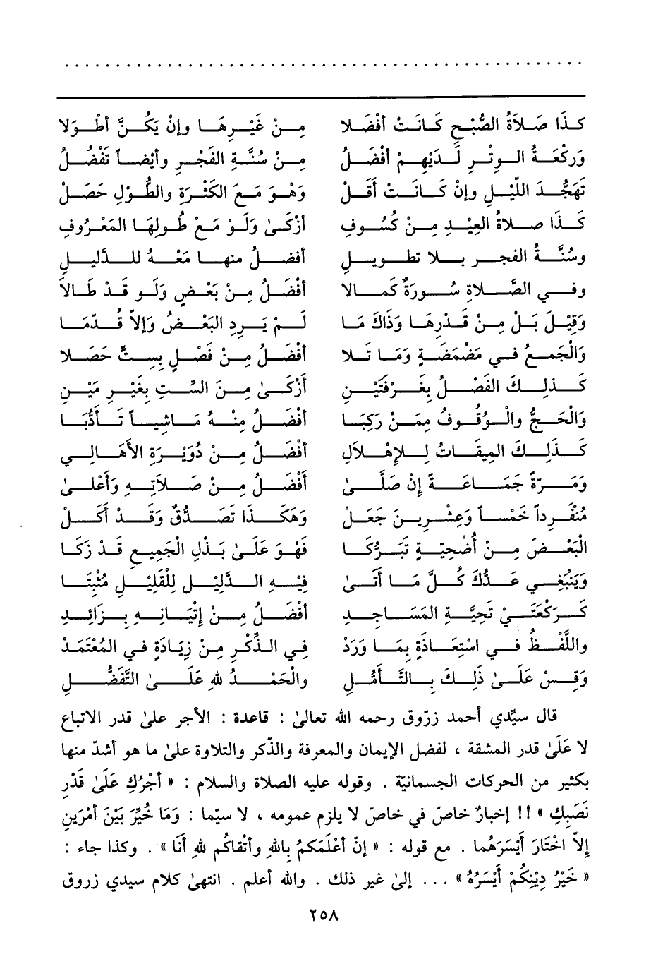 قال سيّدي أحمد زرّوق رحمه الله تعالى: قاعدة: الأجر على قدر الاتباع لا على قدر المشقة، لفضل الإيمان والمعرفة والذّكر والتلاوة على ما هو أشدّ منها بكثير من الحركات الجسمانيّة. وقوله عليه الصلاة والسلام: «أجرك على قدر نصبك» !! إخبار خاصّ في خاصّ لا يلزم عمومه، لا سيّما: وما خيّر بين أمرين إلّا اختار أيسرهما. مع قوله: «إنّ أعلمكم بالله وأتقاكم لله أنا» . وكذا جاء: