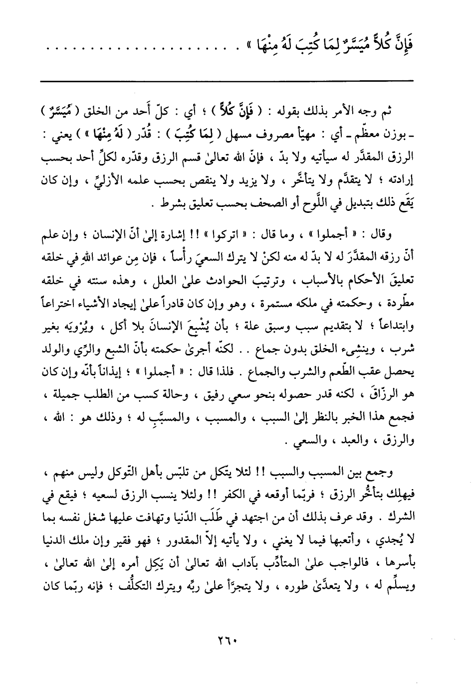 وجمع بين المسبب والسبب!! لئلا يتّكل من تلبّس بأهل التّوكل وليس منهم، فيهلك بتأخّر الرزق؛ فربّما أوقعه في الكفر!! ولئلا ينسب الرزق لسعيه؛ فيقع في الشرك. وقد عرف بذلك أن من اجتهد في طلب الدّنيا وتهافت عليها شغل نفسه بما لا يجدي، وأتعبها فيما لا يغني، ولا يأتيه إلّا المقدور؛ فهو فقير وإن ملك الدنيا بأسرها، فالواجب على المتأدّب باداب الله تعالى أن يكل أمره إلى الله تعالى، ويسلّم له، ولا يتعدّى طوره، ولا يتجرّأ على ربّه ويترك التكلّف؛ فإنه ربّما كان