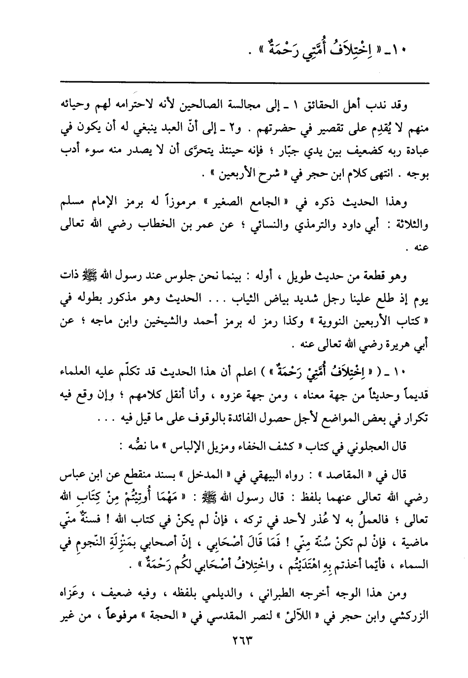 10- ( «اختلاف أمّتي رحمة» ) اعلم أن هذا الحديث قد تكلّم عليه العلماء قديما وحديثا من جهة معناه، ومن جهة عزوه، وأنا أنقل كلامهم؛ وإن وقع فيه تكرار في بعض المواضع لأجل حصول الفائدة بالوقوف على ما قيل فيه ...