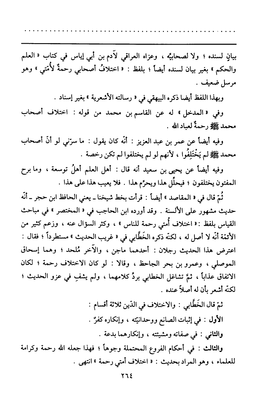 بيان لسنده؛ ولا لصحابيّه، وعزاه العراقي لآدم بن أبي إياس في كتاب «العلم والحكم» بغير بيان لسنده أيضا؛ بلفظ: «اختلاف أصحابي رحمة لأمّتي» وهو مرسل ضعيف.