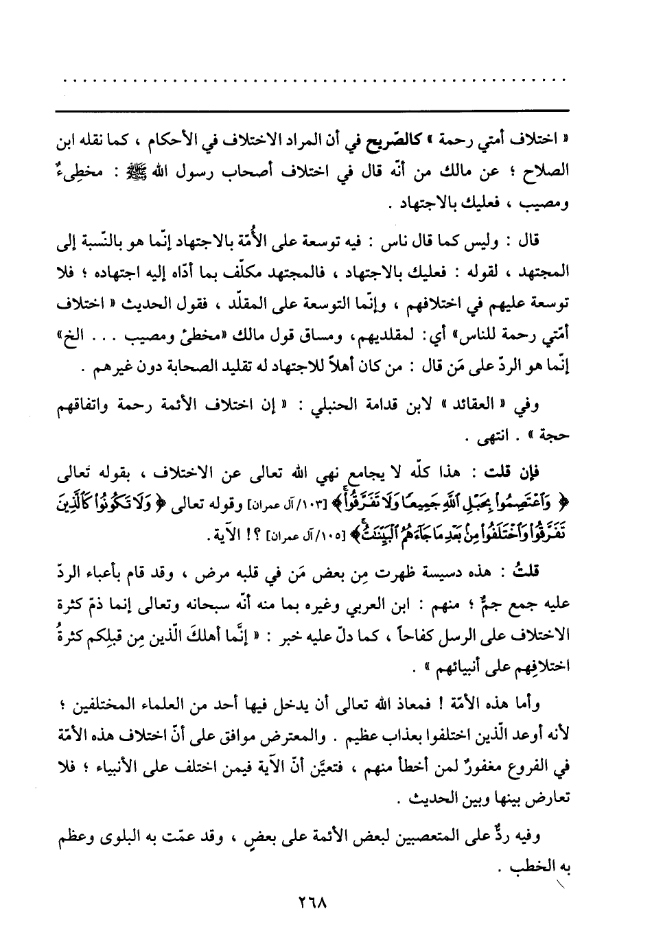 فإن قلت: هذا كلّه لا يجامع نهي الله تعالى عن الاختلاف، بقوله تعالى وَاعْتَصِمُوا بِحَبْلِ اللَّهِ جَمِيعاً وَلا تَفَرَّقُوا [103/ آل عمران] وقوله تعالى وَلا تَكُونُوا كَالَّذِينَ تَفَرَّقُوا وَاخْتَلَفُوا مِنْ بَعْدِ ما جاءَهُمُ الْبَيِّناتُ [105/ آل عمران] ؟! الآية.