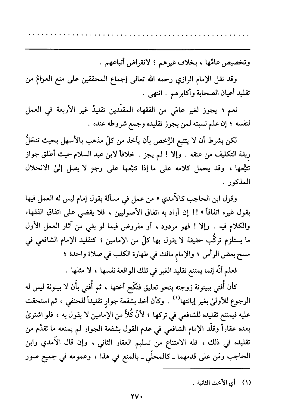 وقول ابن الحاجب كالآمدي «من عمل في مسألة بقول إمام ليس له العمل فيها بقول غيره اتفاقا» !! إن أراد به اتفاق الأصوليين، فلا يقضي على اتفاق الفقهاء والكلام فيه. وإلا! فهو مردود، أو مفروض فيما لو بقي من آثار العمل الأول ما يستلزم تركّب حقيقة لا يقول بها كلّ من الإمامين؛ كتقليد الإمام الشافعي في مسح بعض الرأس؛ والإمام مالك في طهارة الكلب في صلاة واحدة؛