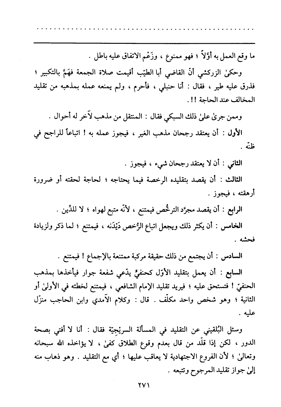 السابع: أن يعمل بتقليد الأوّل كحنفيّ يدّعي شفعة جوار فيأخذها بمذهب الحنفيّ! فتستحق عليه؛ فيريد تقليد الإمام الشافعي، فيمتنع لخطئه في الأولى أو الثانية؛ وهو شخص واحد مكلّف. قال: وكلام الآمدي وابن الحاجب منزّل عليه.