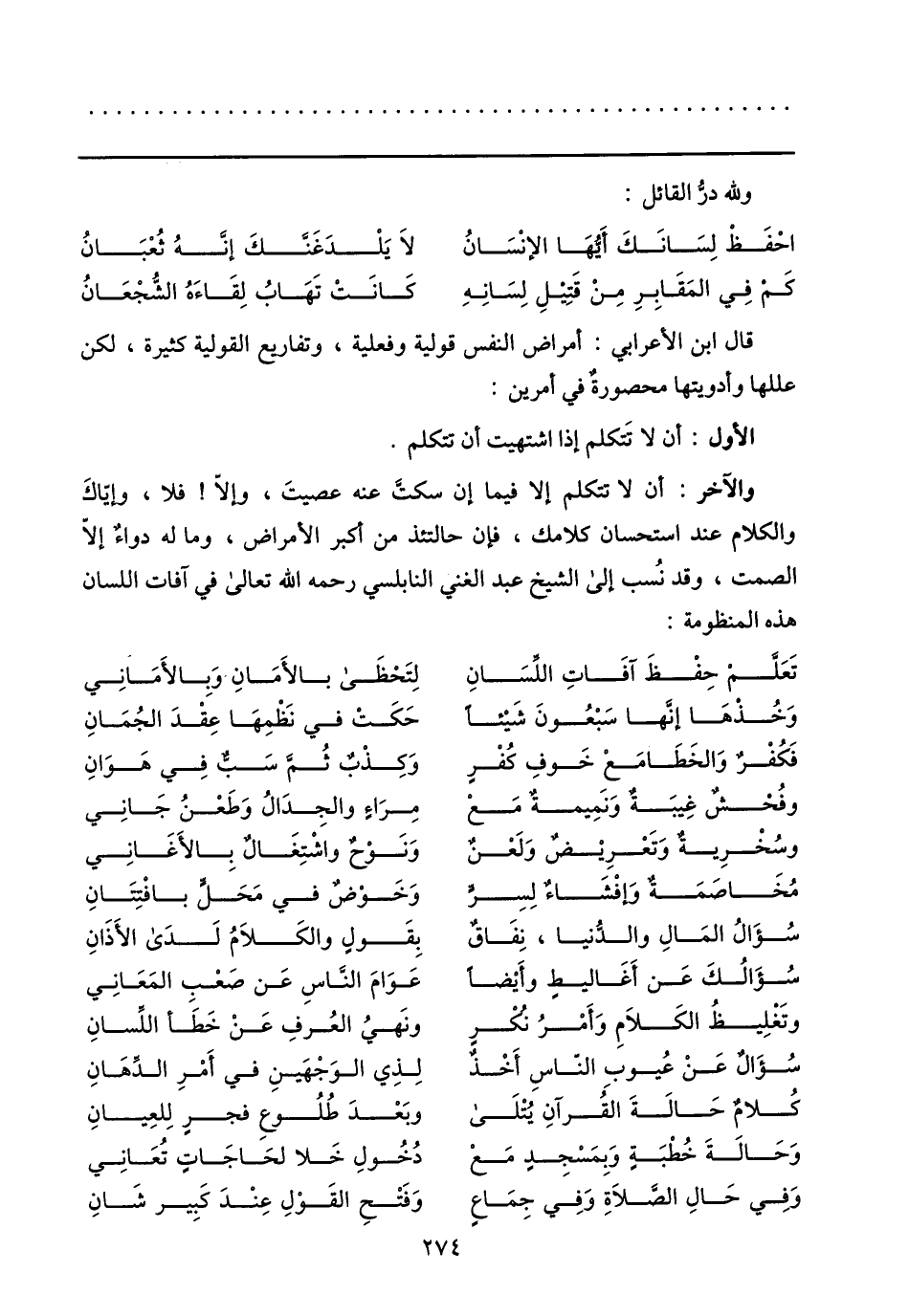 والآخر: ألاتتكلم إلا فيما إن سكتّ عنه عصيت، وإلّا! فلا، وإيّاك والكلام عند استحسان كلامك، فإن حالتئذ من أكبر الأمراض، وما له دواء إلّا الصمت، وقد نسب إلى الشيخ عبد الغني النابلسي رحمه الله تعالى في آفات اللسان هذه المنظومة:
