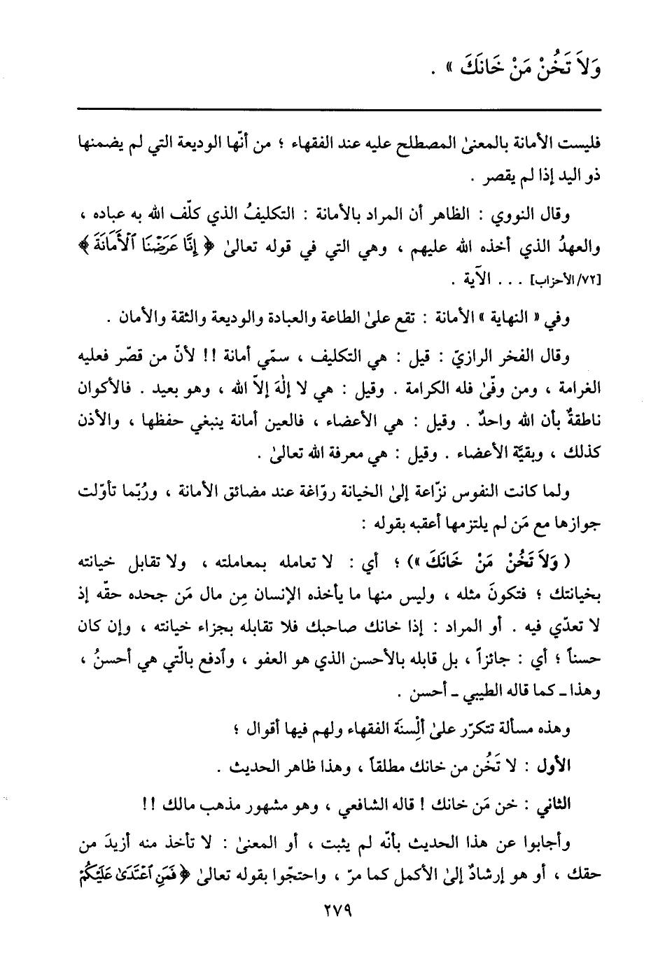 وقال النووي: الظاهر أن المراد بالأمانة: التكليف الذي كلّف الله به عباده، والعهد الذي أخذه الله عليهم، وهي التي في قوله تعالى إِنَّا عَرَضْنَا الْأَمانَةَ [72/ الأحزاب] ... الآية.