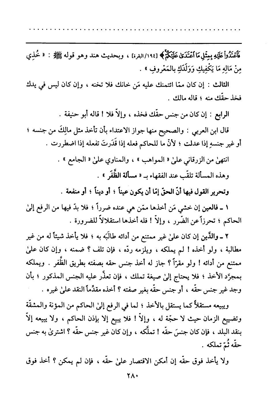 فَاعْتَدُوا عَلَيْهِ بِمِثْلِ مَا اعْتَدى عَلَيْكُمْ [194/ البقرة] ، وبحديث هند وهو قوله صلى الله عليه وسلم: «خذي من ماله ما يكفيك وولدك بالمعروف» .