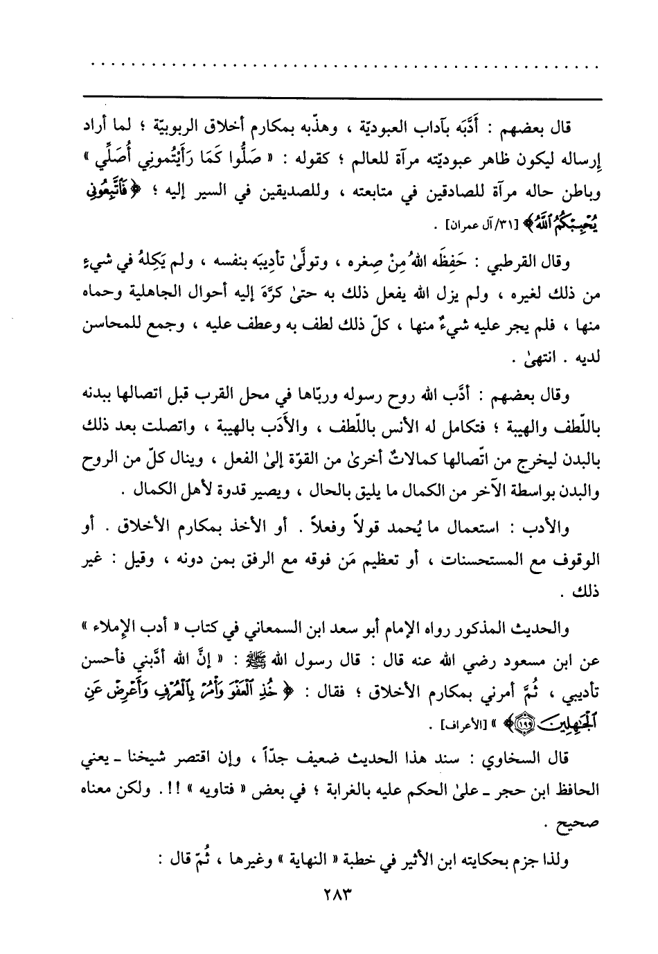 والحديث المذكور رواه الإمام أبو سعد ابن السمعاني في كتاب «أدب الإملاء» عن ابن مسعود رضي الله عنه قال: قال رسول الله صلى الله عليه وسلم: «إنّ الله أدّبني فأحسن تأديبي، ثمّ أمرني بمكارم الأخلاق؛ فقال: خُذِ الْعَفْوَ وَأْمُرْ بِالْعُرْفِ وَأَعْرِضْ عَنِ الْجاهِلِينَ (199) » [الأعراف] .