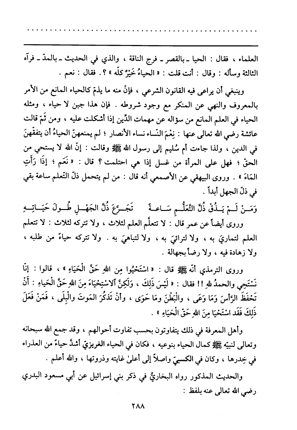 وينبغي أن يراعى فيه القانون الشرعي، فإنّ منه ما يذمّ كالحياء المانع من الأمر بالمعروف والنهي عن المنكر مع وجود شروطه. فإن هذا جبن لا حياء، ومثله الحياء في العلم المانع من سؤاله عن مهمات الدّين إذا أشكلت عليه، ومن ثمّ قالت عائشة رضي الله تعالى عنها: نعم النّساء نساء الأنصار؛ لم يمنعهنّ الحياء أن يتفقّهن في الدين، ولذا جاءت أم سليم إلى رسول الله صلى الله عليه وسلّم وقالت: إنّ الله لا يستحي من الحقّ؛ فهل على المرأة من غسل إذا هي احتلمت؟ قال: «نعم؛ إذا رأت الماء» . وروى البيهقي عن الأصمعي أنه قال: من لم يتحمل ذلّ التّعلم ساعة بقي في ذلّ الجهل أبدا.
