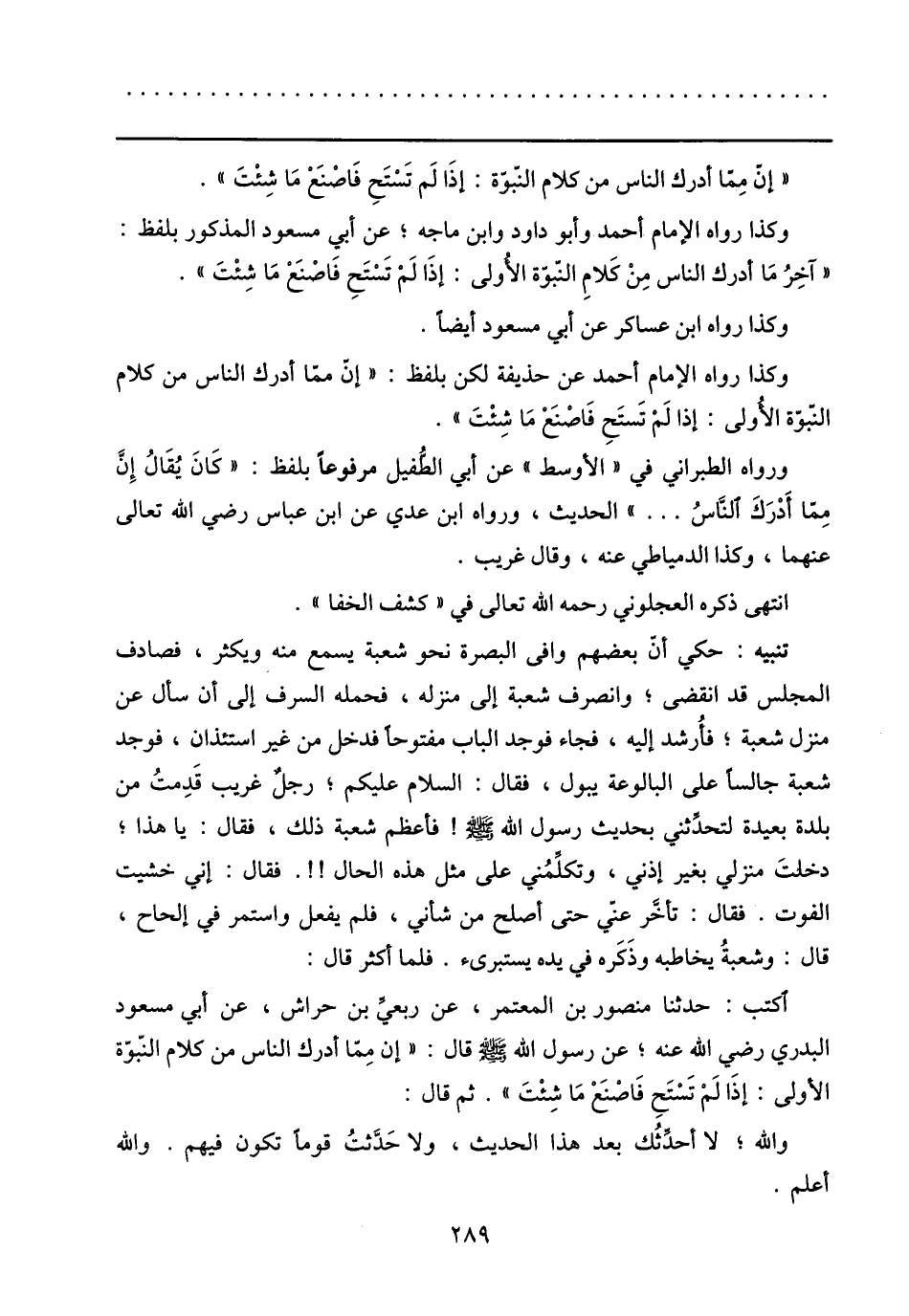 اكتب: حدثنا منصور بن المعتمر، عن ربعيّ بن حراش، عن أبي مسعود البدري رضي الله عنه؛ عن رسول الله صلى الله عليه وسلّم قال: «إن ممّا أدرك الناس من كلام النّبوّة الأولى: إذا لم تستح فاصنع ما شئت» . ثم قال: