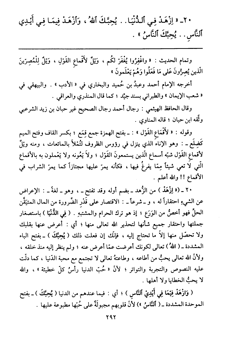 20- ( «ازهد) من الزّهد- بضم أوله وقد تفتح-، وهو- لغة-: الإعراض عن الشيء احتقارا له، وشرعا-: الاقتصار على قدر الضّرورة من المال المتيقّن الحلّ فهو أخصّ من الورع؛ إذ هو ترك الحرام والمشتبه. (في الدّنيا) باستصغار جملتها واحتقار جميع شأنها لتحذير الله تعالى منها؛ أي: أعرض عنها بقلبك ولا تحصّل منها إلّا ما تحتاج إليه، فإنّك إن فعلت ذلك (يحبّك) - بفتح الباء المشددة- (الله) تعالى لكونك أعرضت عمّا أعرض عنه؛ ولم ينظر إليه منذ خلقه، ولأنّ الله تعالى يحبّ من أطاعه، وطاعته تعالى لا تجتمع مع محبة الدّنيا، كما دلّت عليه النصوص والتجربة والتواتر؛ لأنّ «حبّ الدنيا رأس كلّ خطيئة» ، والله لا يحبّ الخطايا ولا أهلها.