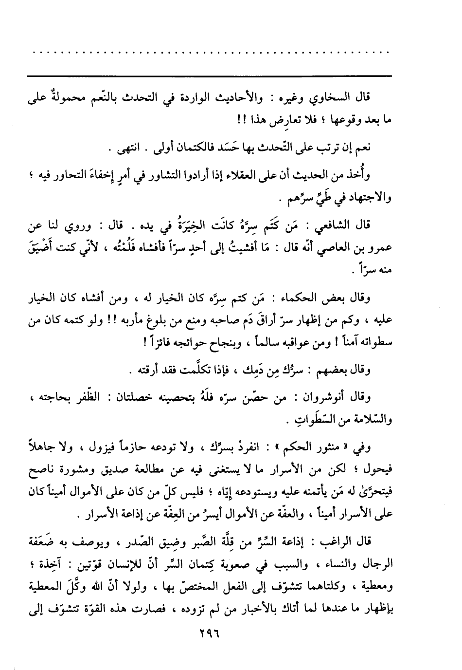 وفي «منثور الحكم» : انفرد بسرّك، ولا تودعه حازما فيزول، ولا جاهلا فيحول؛ لكن من الأسرار ما لا يستغنى فيه عن مطالعة صديق ومشورة ناصح فيتحرّى له من يأتمنه عليه ويستودعه إيّاه؛ فليس كلّ من كان على الأموال أمينا كان على الأسرار أمينا، والعفّة عن الأموال أيسر من العفّة عن إذاعة الأسرار.