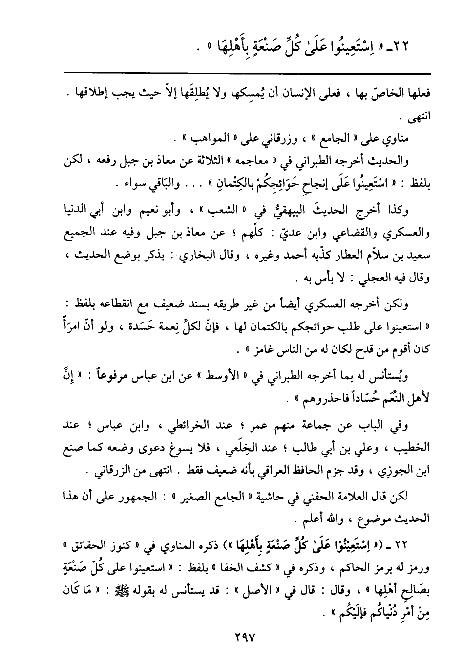 22- ( «استعينوا على كلّ صنعة بأهلها» ) ذكره المناوي في «كنوز الحقائق» ورمز له برمز الحاكم، وذكره في «كشف الخفا» بلفظ: «استعينوا على كلّ صنعة بصالح أهلها» ، وقال: قال في «الأصل» : قد يستأنس له بقوله صلى الله عليه وسلم: «ما كان من أمر دنياكم فإليكم» .