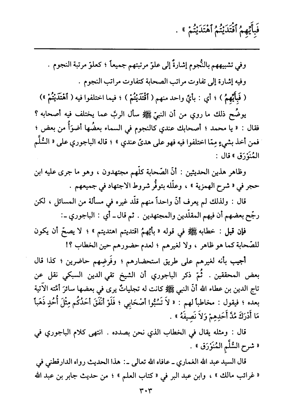 فقال: «يا محمد؛ أصحابك عندي كالنجوم في السماء بعضها أضوأ من بعض؛ فمن أخذ بشيء ممّا اختلفوا فيه فهو على هدى عندي» ؛ قاله الباجوري على «السّلّم المنورق» قال: