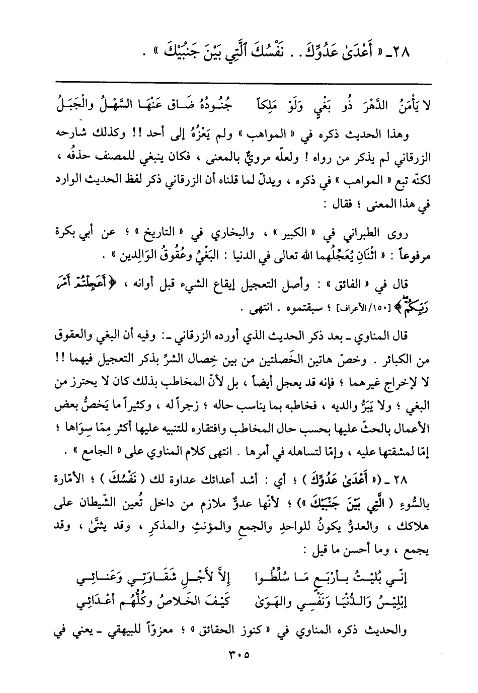 28- ( «أعدى عدوّك) ؛ أي: أشد أعدائك عداوة لك (نفسك) ؛ الأمّارة بالسّوء (الّتي بين جنبيك» ) ؛ لأنّها عدوّ ملازم من داخل تعين الشّيطان على هلاكك، والعدوّ يكون للواحد والجمع والمؤنث والمذكر، وقد يثنّى، وقد يجمع، وما أحسن ما قيل: