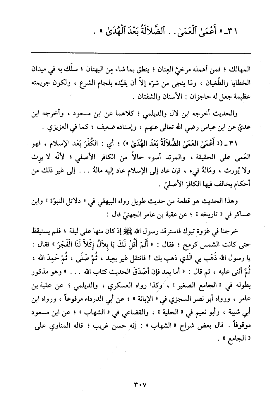 31- ( «أعمى العمى الضّلالة بعد الهدى» ) ؛ أي: الكفر بعد الإسلام، فهو العمى على الحقيقة، والمرتد أسوء حالا من الكافر الأصلي؛ لأنّه لا يرث ولا يورث، وماله فيء، فإن عاد إلى الإسلام عاد إليه ماله ... إلى غير ذلك من أحكام يخالف فيها الكافر الأصليّ.