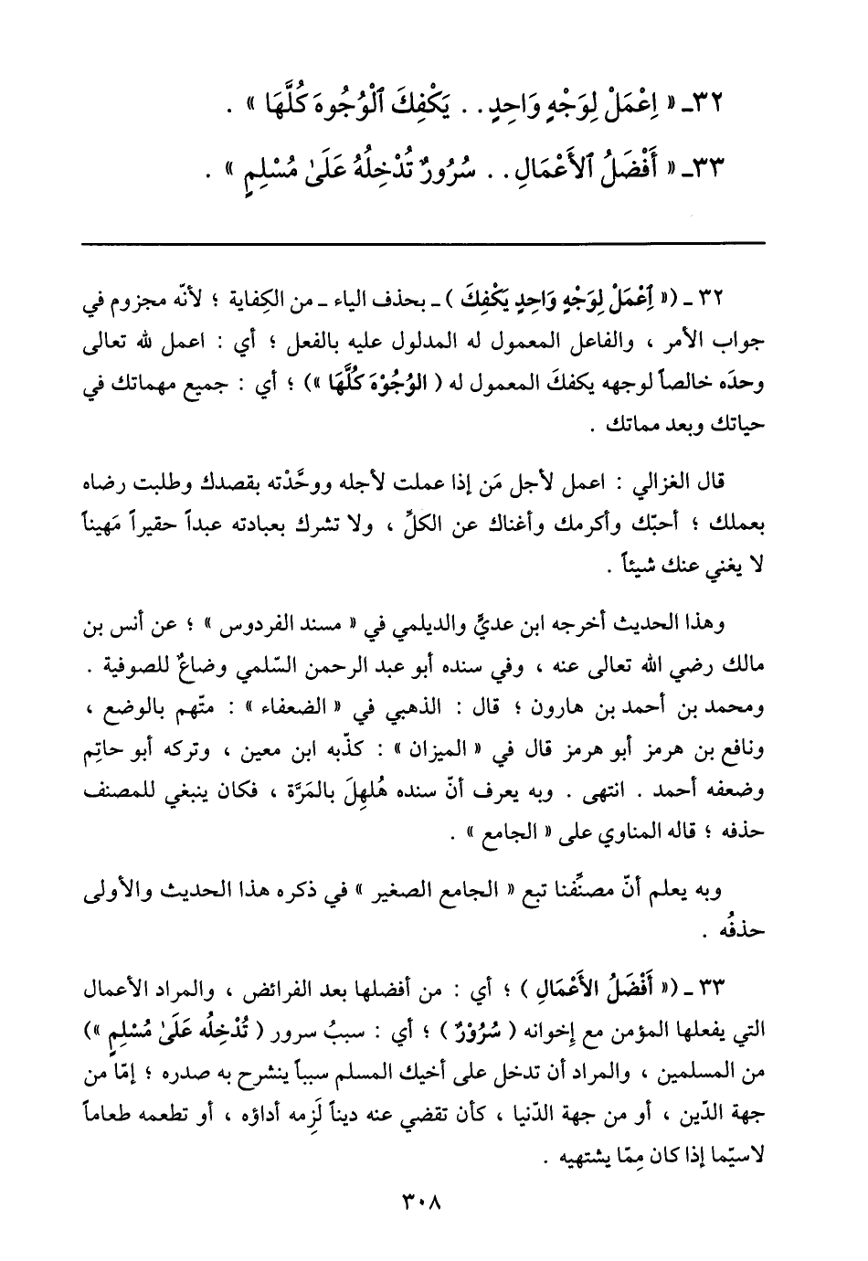 32- ( «اعمل لوجه واحد يكفك) - بحذف الياء- من الكفاية؛ لأنّه مجزوم في جواب الأمر، والفاعل المعمول له المدلول عليه بالفعل؛ أي: اعمل لله تعالى وحده خالصا لوجهه يكفك المعمول له (الوجوه كلّها» ) ؛ أي: جميع مهماتك في حياتك وبعد مماتك.