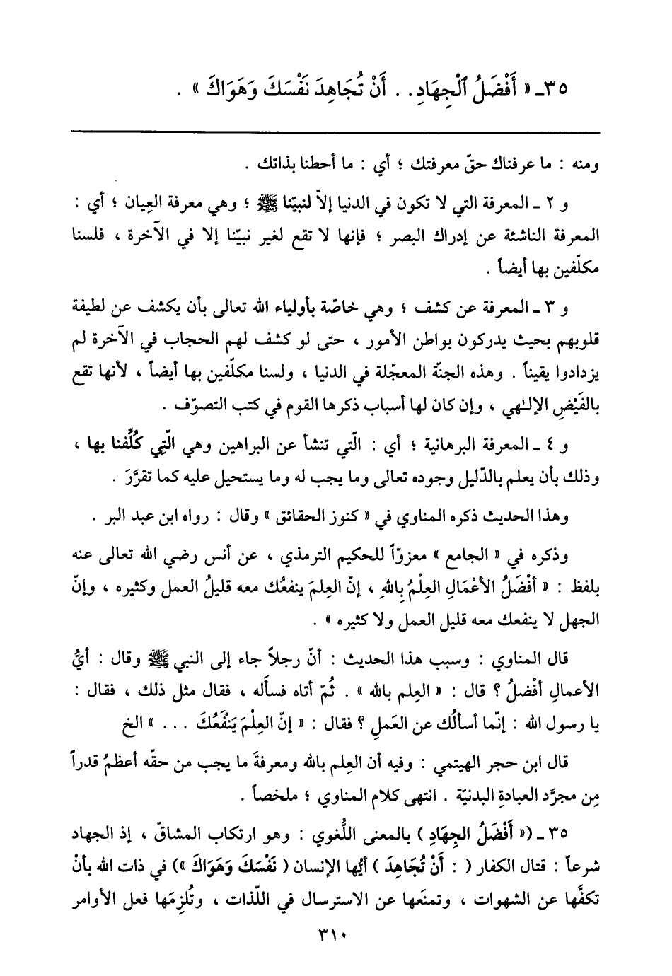 35- ( «أفضل الجهاد) بالمعنى اللّغوي: وهو ارتكاب المشاقّ، إذ الجهاد شرعا: قتال الكفار (: أن تجاهد) أيّها الإنسان (نفسك وهواك» ) في ذات الله بأن تكفّها عن الشهوات، وتمنعها عن الاسترسال في اللّذات، وتلزمها فعل الأوامر
