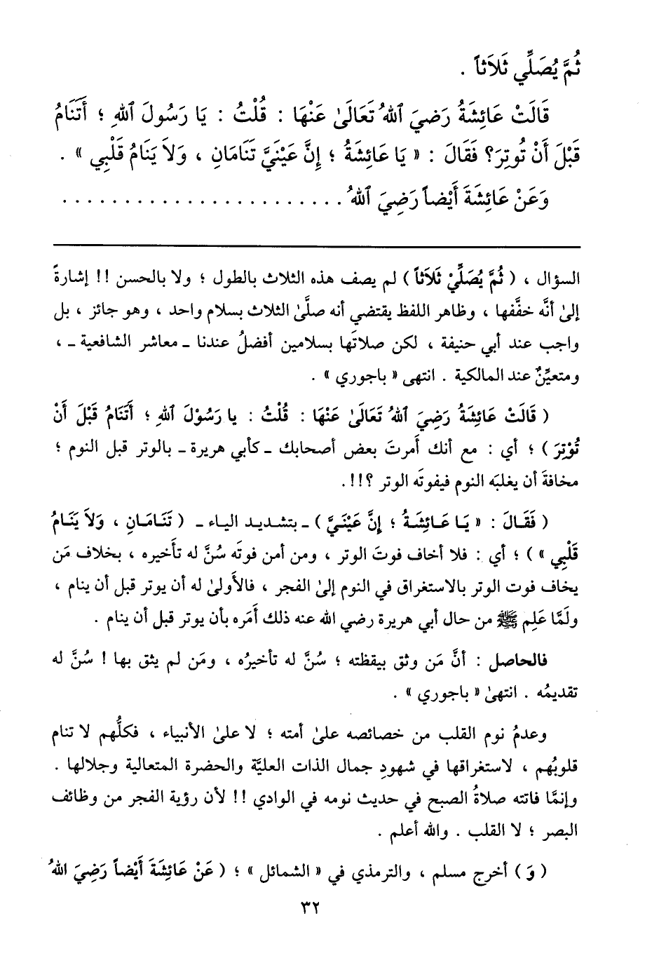 قالت عائشة رضي الله تعالى عنها: قلت: يا رسول الله؛ أتنام قبل أن توتر؟ فقال: «يا عائشة؛ إنّ عينيّ تنامان، ولا ينام قلبي» .