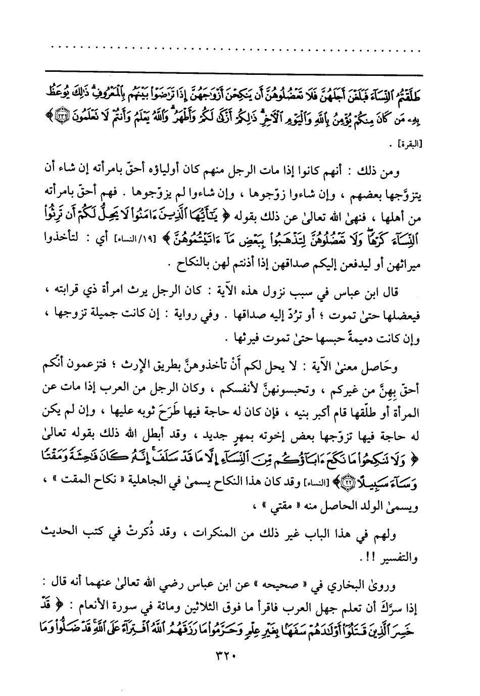 ومن ذلك: أنهم كانوا إذا مات الرجل منهم كان أولياؤه أحقّ بامرأته إن شاء أن يتزوّجها بعضهم، وإن شاؤا زوّجوها، وإن شاؤا لم يزوّجوها. فهم أحقّ بامرأته من أهلها، فنهى الله تعالى عن ذلك بقوله يا أَيُّهَا الَّذِينَ آمَنُوا لا يَحِلُّ لَكُمْ أَنْ تَرِثُوا النِّساءَ كَرْهاً وَلا تَعْضُلُوهُنَّ لِتَذْهَبُوا بِبَعْضِ ما آتَيْتُمُوهُنَّ [19/ النساء] أي: لتأخذوا ميراثهن أو ليدفعن إليكم صداقهن إذا أذنتم لهن بالنكاح.