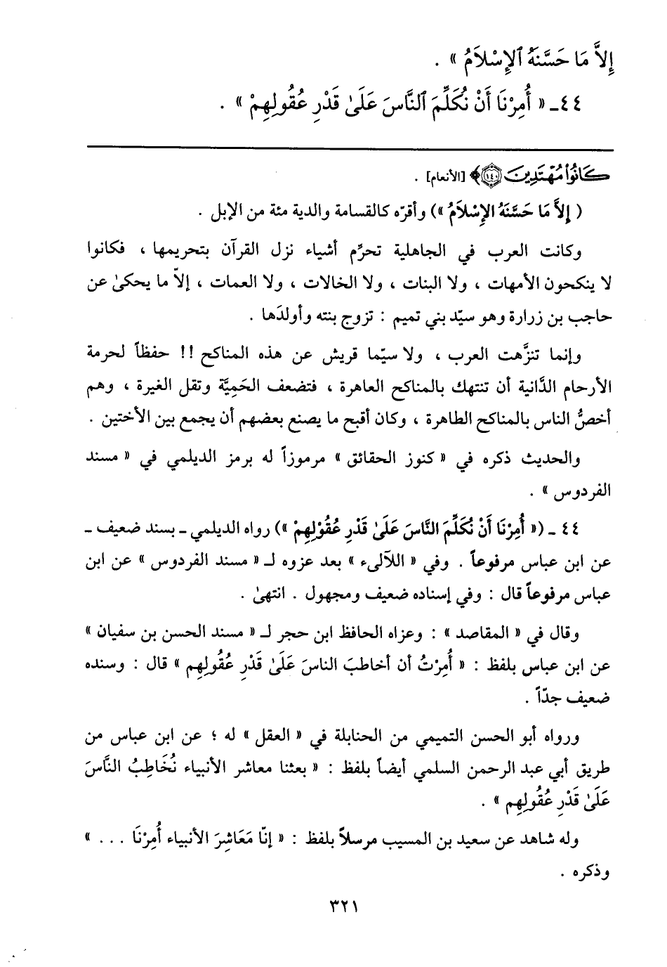 44- ( «أمرنا أن نكلّم النّاس على قدر عقولهم» ) رواه الديلمي- بسند ضعيف- عن ابن عباس مرفوعا. وفي «اللآلئ» بعد عزوه ل «مسند الفردوس» عن ابن عباس مرفوعا قال: وفي إسناده ضعيف ومجهول. انتهى.