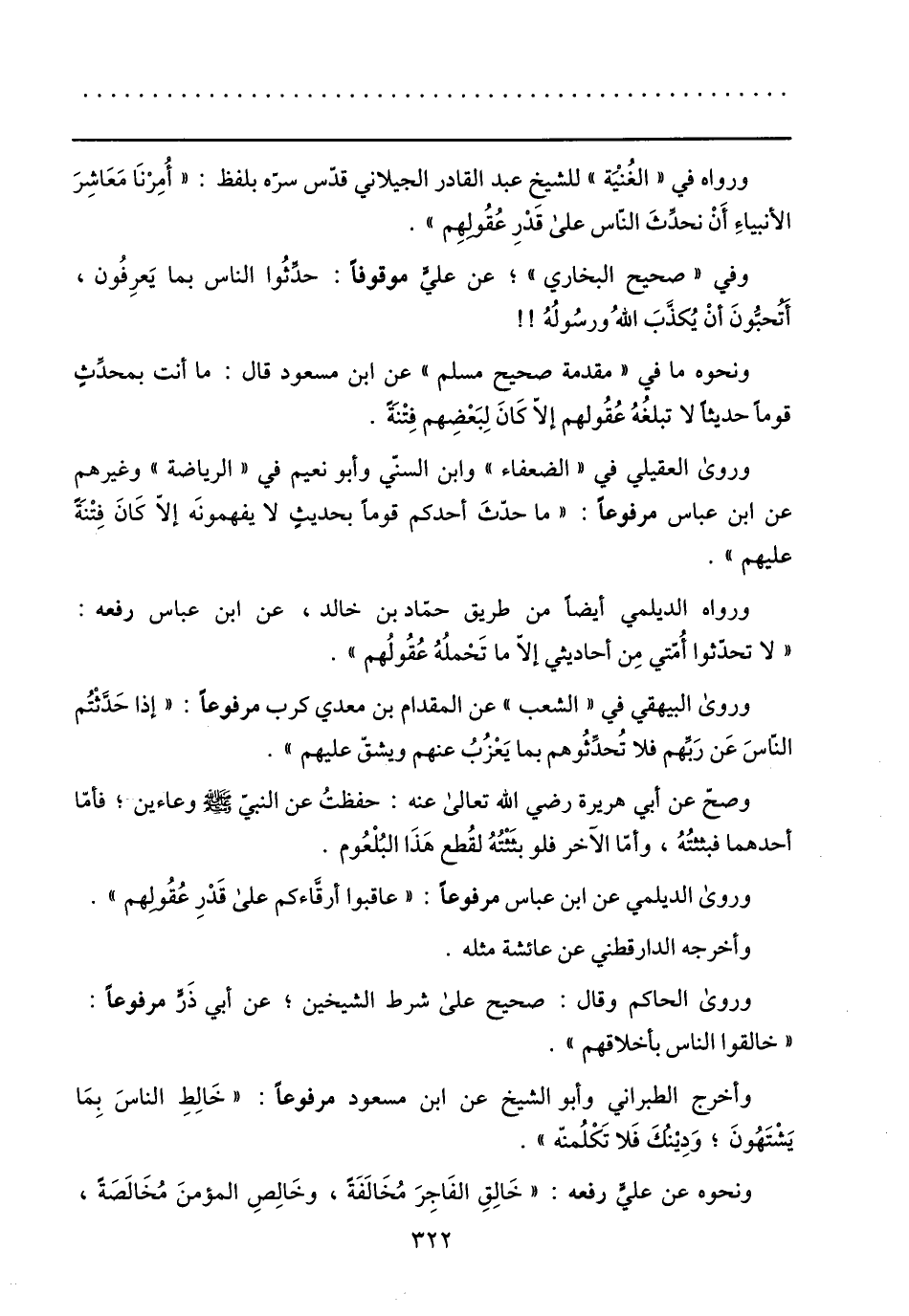 وروى العقيلي في «الضعفاء» وابن السنّي وأبو نعيم في «الرياضة» وغيرهم عن ابن عباس مرفوعا: «ما حدّث أحدكم قوما بحديث لا يفهمونه إلّا كان فتنة عليهم» .