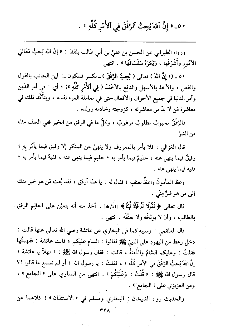 50- ( «إنّ الله) تعالى (يحبّ الرّفق) - بكسر فسكون-: لين الجانب بالقول والفعل، والأخذ بالأسهل والدفع بالأخفّ (في الأمر كلّه» ) ؛ أي: في أمر الدّين وأمر الدنيا في جميع الأحوال والأفعال حتى في معاملة المرء نفسه، ويتأكّد ذلك في معاشرة من لا بدّ من معاشرته؛ كزوجته وخادمه وولده.