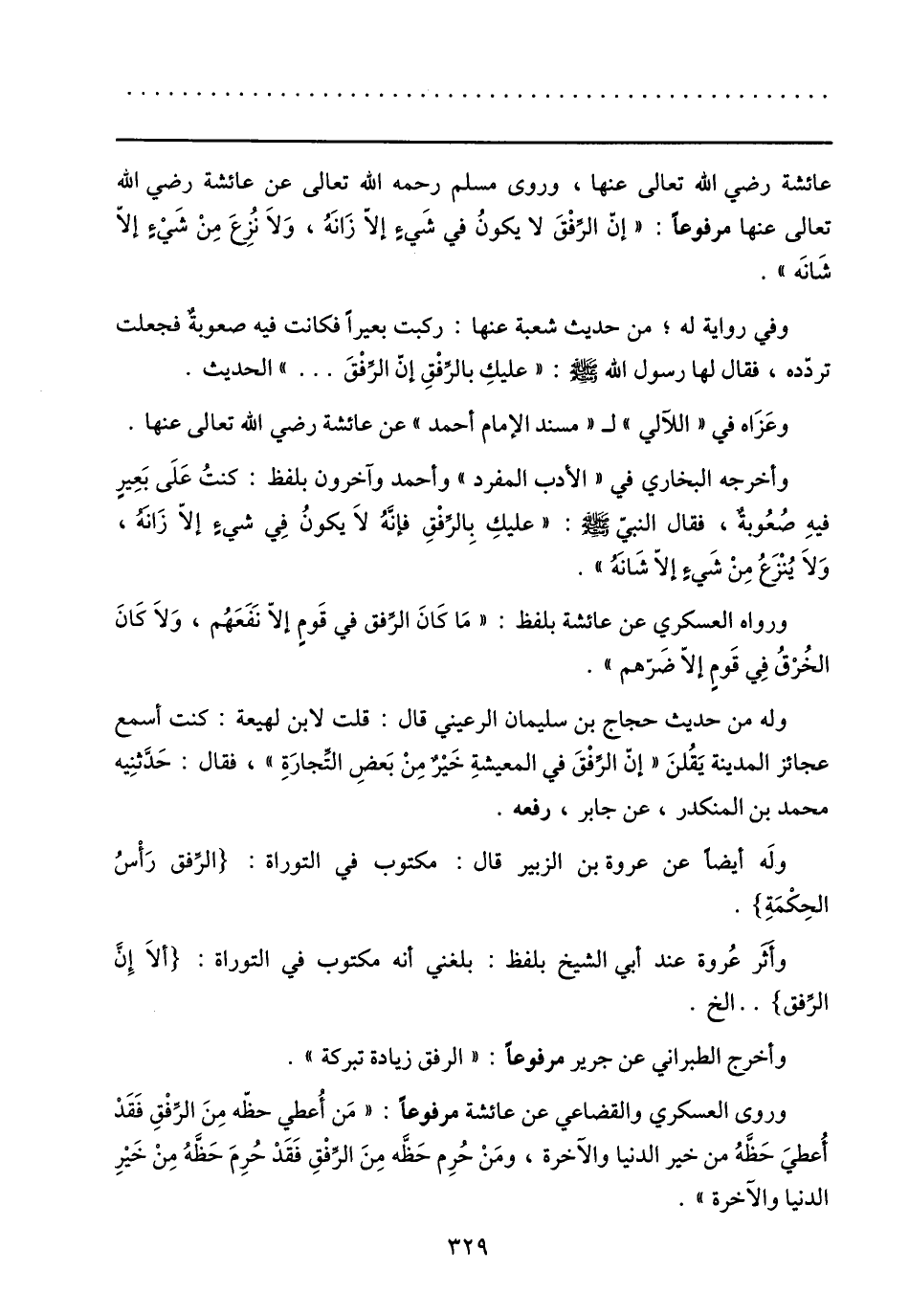 عائشة رضي الله تعالى عنها، وروى مسلم رحمه الله تعالى عن عائشة رضي الله تعالى عنها مرفوعا: «إنّ الرّفق لا يكون في شيء إلّا زانه، ولا نزع من شيء إلّا شانه» .