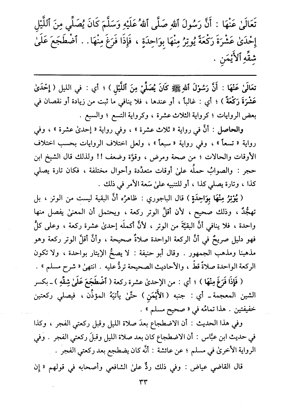 تعالى عنها: أنّ رسول الله صلّى الله عليه وسلّم كان يصلّي من اللّيل إحدى عشرة ركعة يوتر منها بواحدة، فإذا فرغ منها.. اضطجع على شقّه الأيمن.